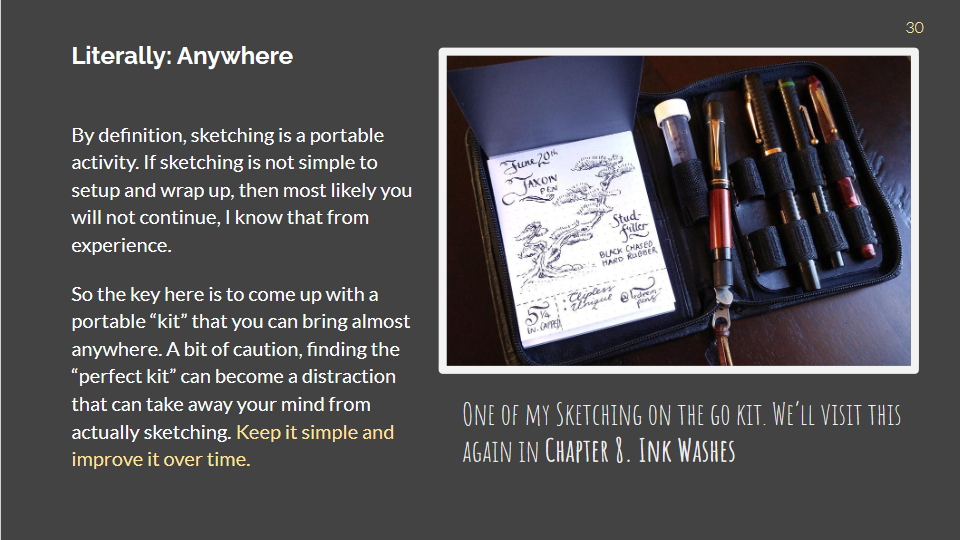 Encapsulated in a portable PDF ebook, you'll find over 60 of my sketches and lots of mindset coaching, tips and pointers in 10 Chapters. Take-away exercises end each chapter to help you start and continue your sketching journey.